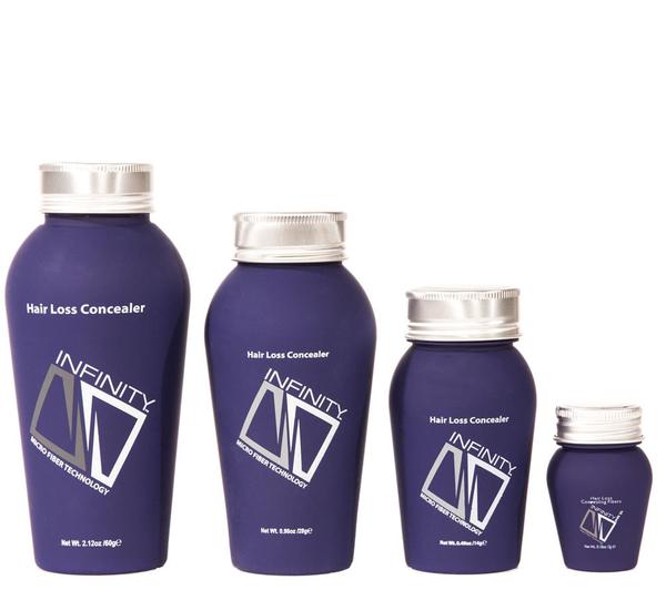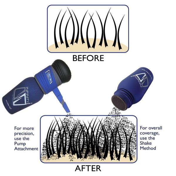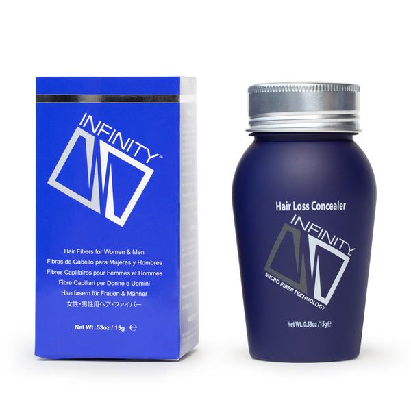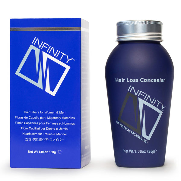 Infinity Hair Fibers, for Women & Men, provides the appearance of Thicker, Fuller Hair in 20 seconds or less. The micro hair fibers use static electricity and become electrostatically charged as they're shaken or pumped (with Infinity Hair Fiber Applicator) into the thinning areas.